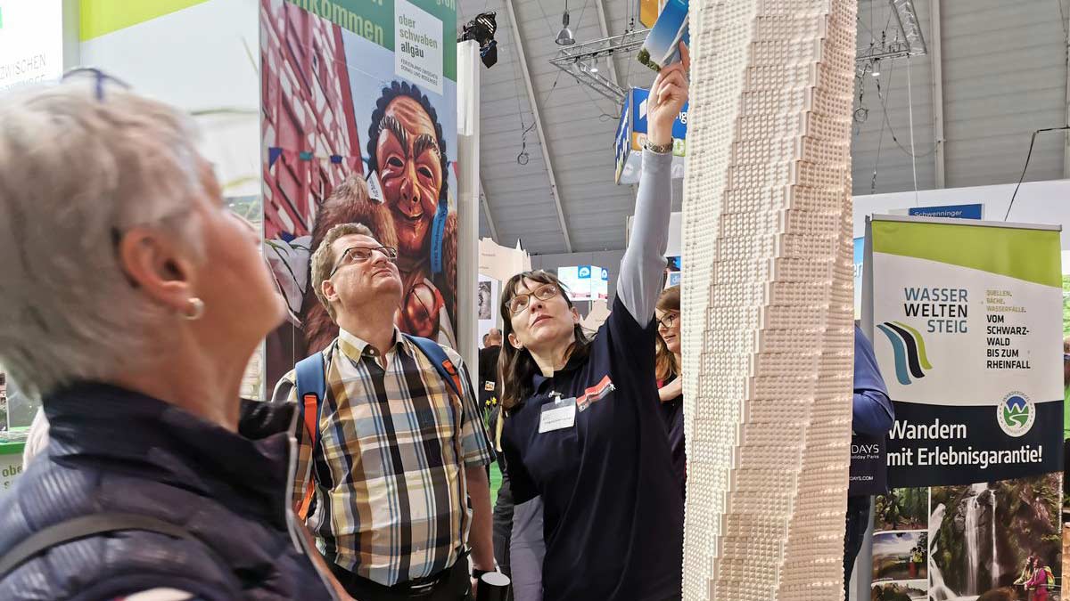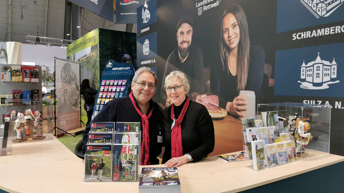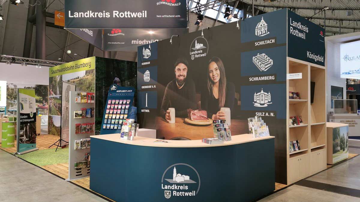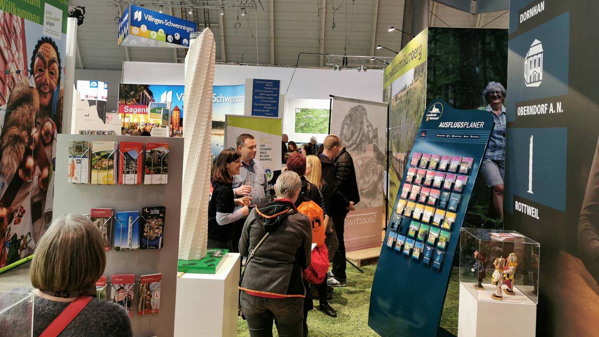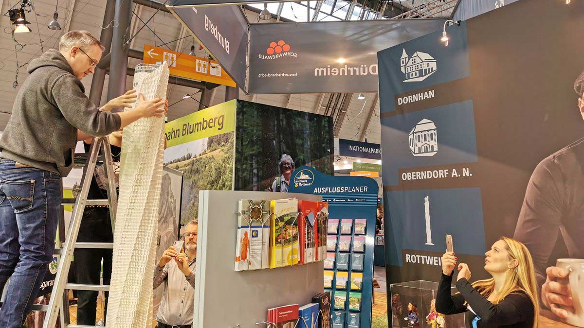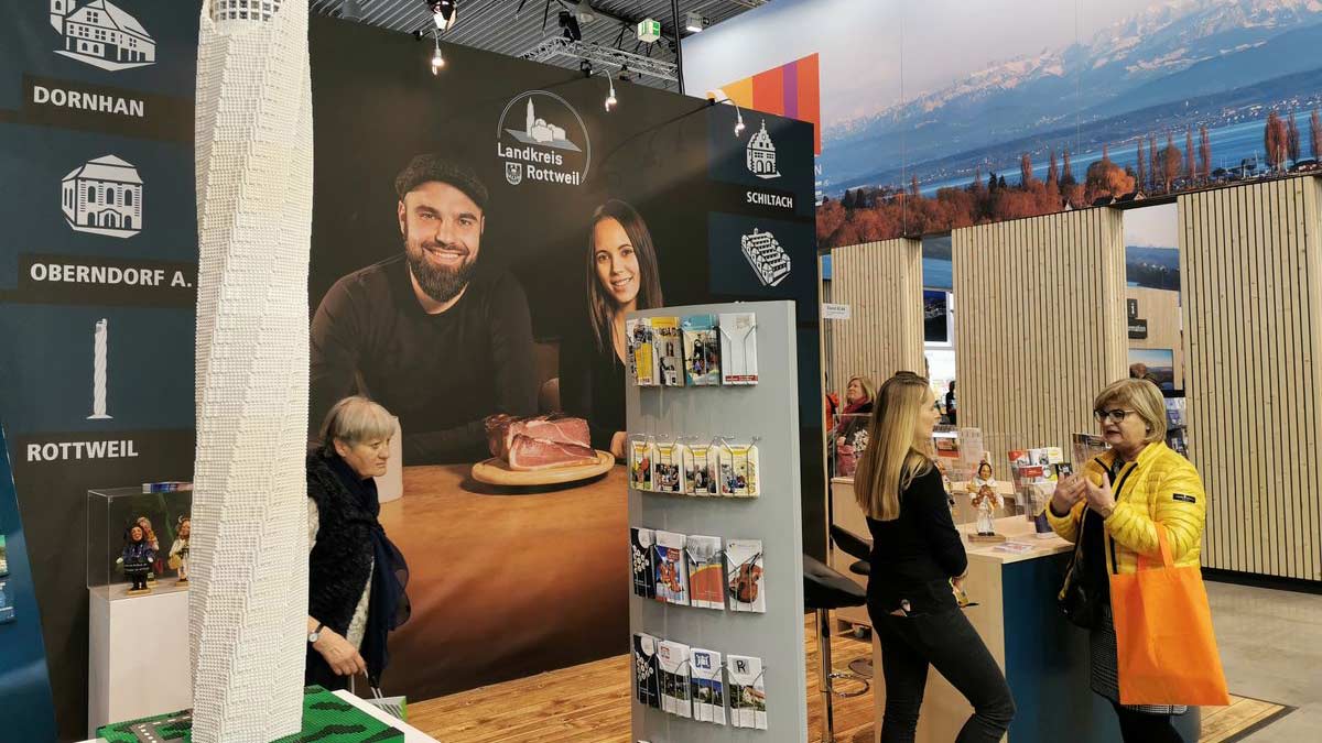 In der Halle 6 stellte der Stand des Landkreises Rottweil mit dem Thyssenkrupp Testturm als wahrer Leuchtturm im Mittelpunkt die touristischen Attraktionen von Rottweil, Oberndorf, Schramberg, Schiltach und Dornhan vor, schwerpunktmäßig in Sachen Wandern und Radfahren.