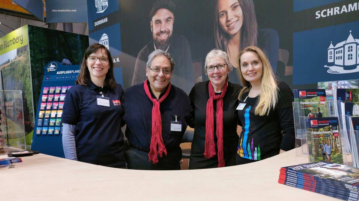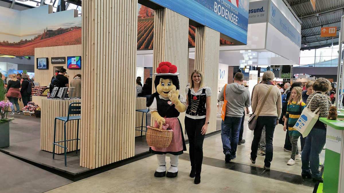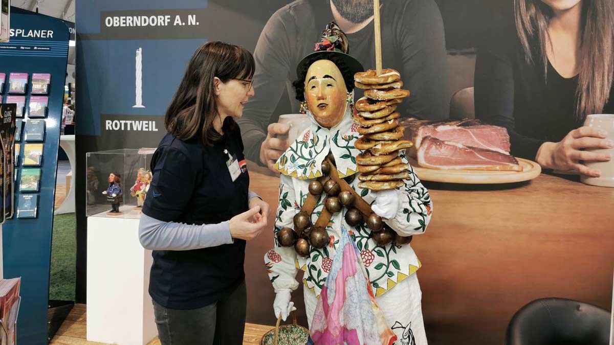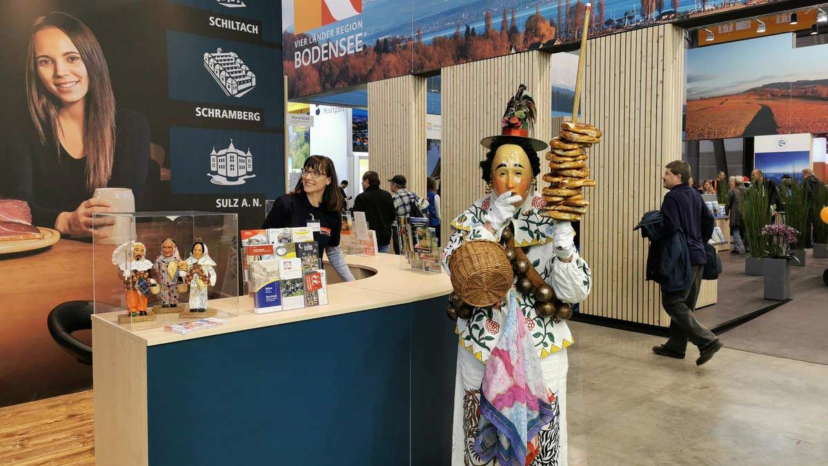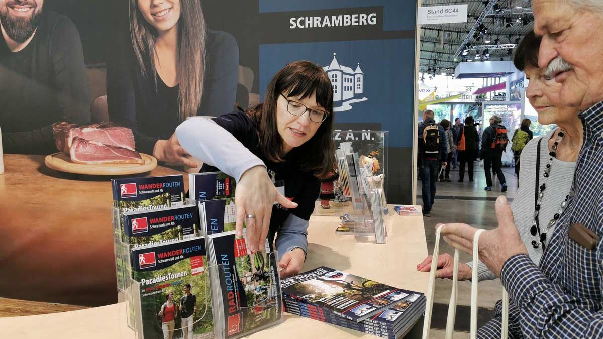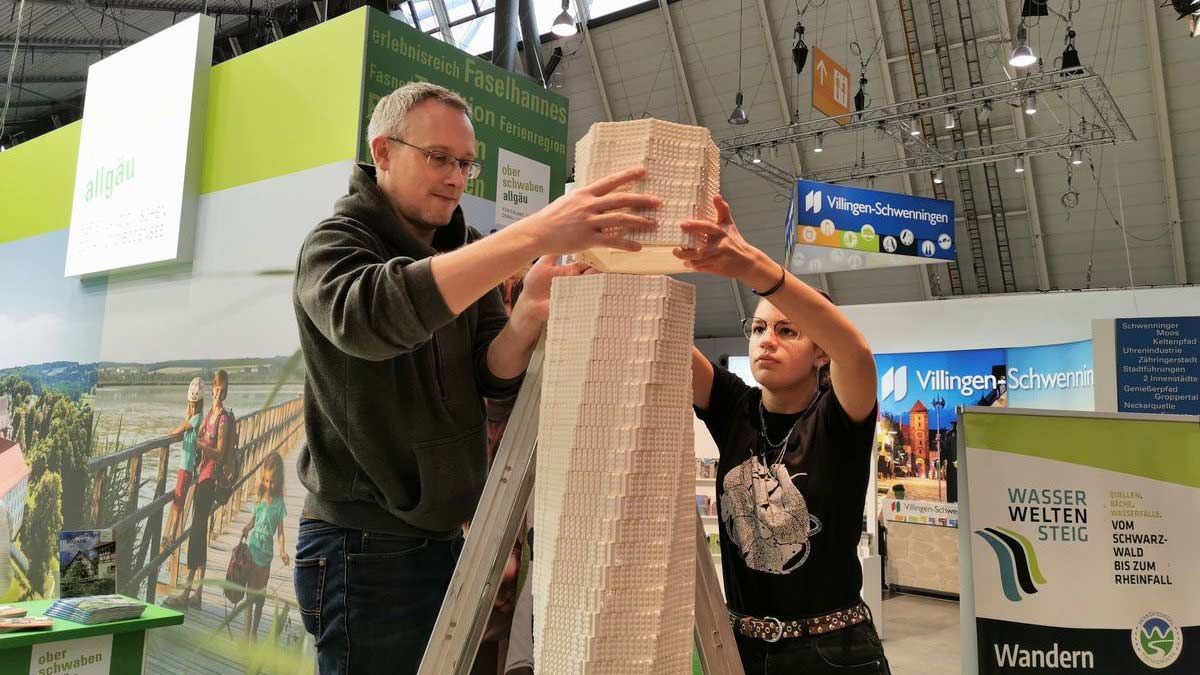 In der Halle 6 stellte der Stand des Landkreises Rottweil mit dem Thyssenkrupp Testturm als wahrer Leuchtturm im Mittelpunkt die touristischen Attraktionen von Rottweil, Oberndorf, Schramberg, Schiltach und Dornhan vor, schwerpunktmäßig in Sachen Wandern und Radfahren.