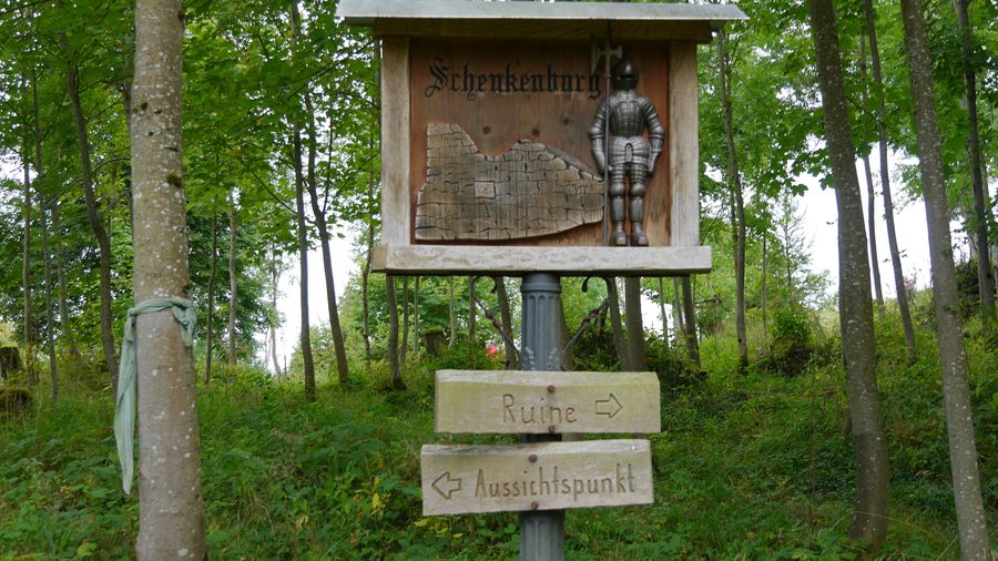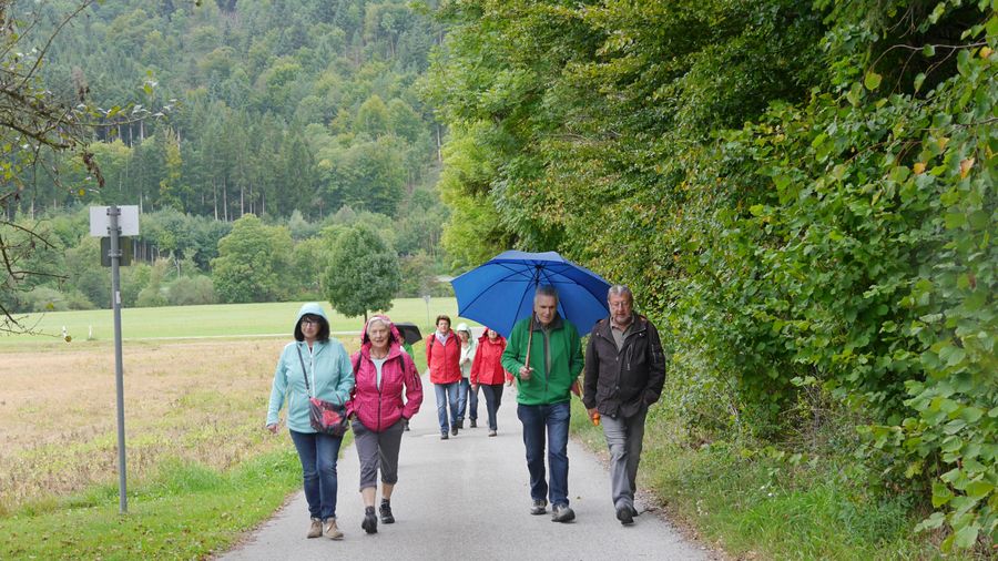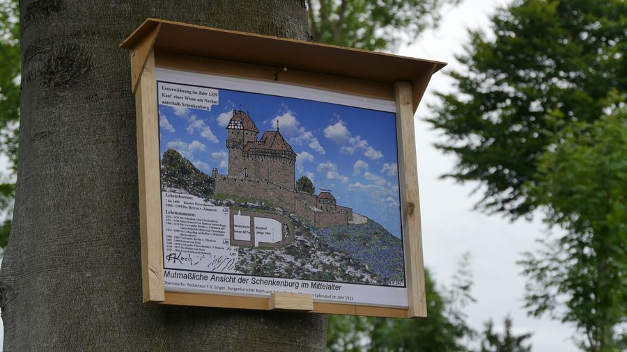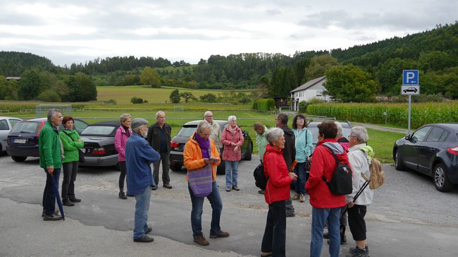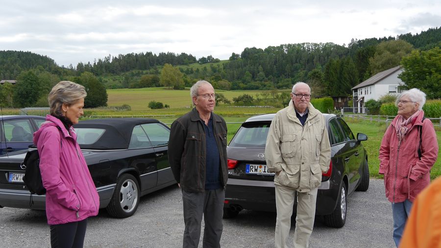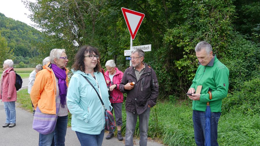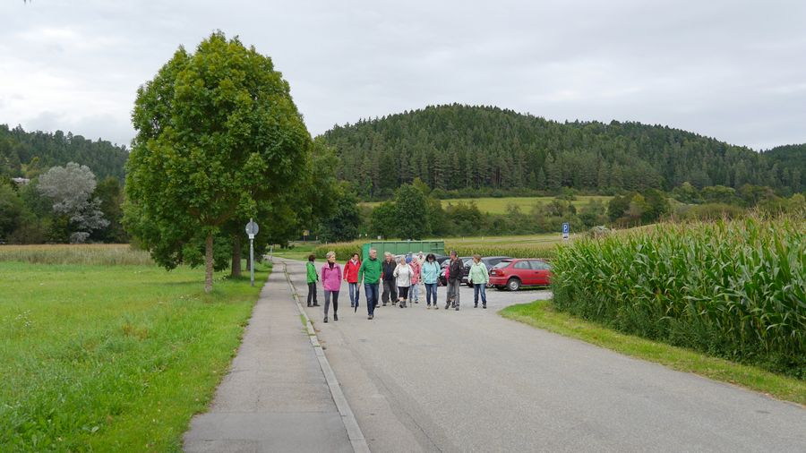 Obwohl die Wettervorhersage zu 90% Regen voraussagte, blieb die Wandergruppe vor Regengüssen verschont. Sammelpunkt war der Altoberndorfer Sportplatz. Nach einer Einführung und Beschreibung der Strecke von Helmut Große, der mit seiner Frau Elisabeth am Tag zuvor die 7 km Strecke inspizierte und von Brennnesseln, Ranken und stachelnden Brombeerzweigen mühevoll ausgelichtet hatte, ging es los Richtung Epfendorf mit dem ersten Etappenziel, die SCHENKENBURG.