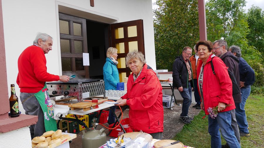 Den Julieweg entlang erreichte dann die Gruppe die Altobernorfer Kreuzbergkapelle, von den Einheimischen liebevoll "das Käppele" genannt, wo die Wanderer von Mitgliedern des Alb- und Tourismusvereins mit kulinarischen Köstlichkeiten und Getränken empfangen wurden.